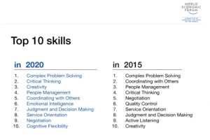 In the future, we’ll need to create roles and educational processes that centre less on a set of discrete on tasks, and more of a set of core skills and competencies. Here for instance is an example of the types of competencies that the World Economic Forum has recommended that we focus on in the near future: